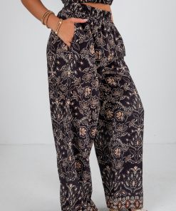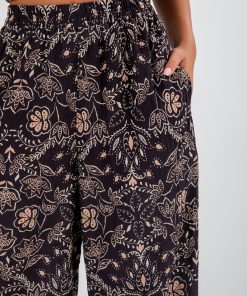 The In Your Happy Place Black Floral Pants combine comfort and effortless style! Featuring a flowy wide-leg silhouette and a stretchy elastic waistband, these pants offer a relaxed fit that moves with you. The delicate floral print on a classic black base adds a feminine touch, making them perfect for pairing with a fitted top for a balanced look or a casual tee for an easygoing, chic outfit! Lightweight Woven Knit Fabrication Floral Print Elastic Waistband Flowy Wide Pant Legs Side Pockets Lined Pockets Self: 83% Rayon, 17% Nylon Lining: 100% Rayon Hand Wash Cold, Lay Flat to Dry Models are 5’4″ + 5’6″ and are wearing a Small.Garment Measurements in Inches:Small | Waist 26” (Stretches up to 32″) | Hips 46” | Length 40” | Inseam 28″Medium | Waist 28” (Stretches up to 34″) | Hips 48” | Length 41” | Inseam 28.5″Large | Waist 30” (Stretches up to 36″) | Hips 50” | Length 42” | Inseam 29″